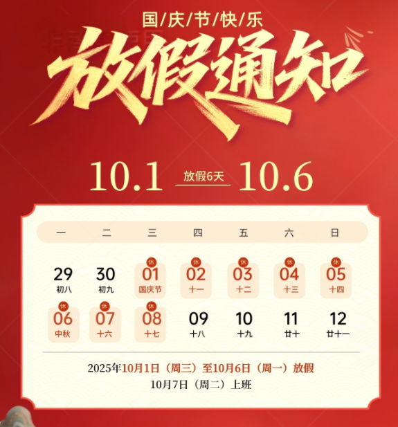 2025年浙江雷力汽车零部件有限公司国庆中秋双节放假通知,祝大家佳节愉快,阖家安康,事业顺遂!