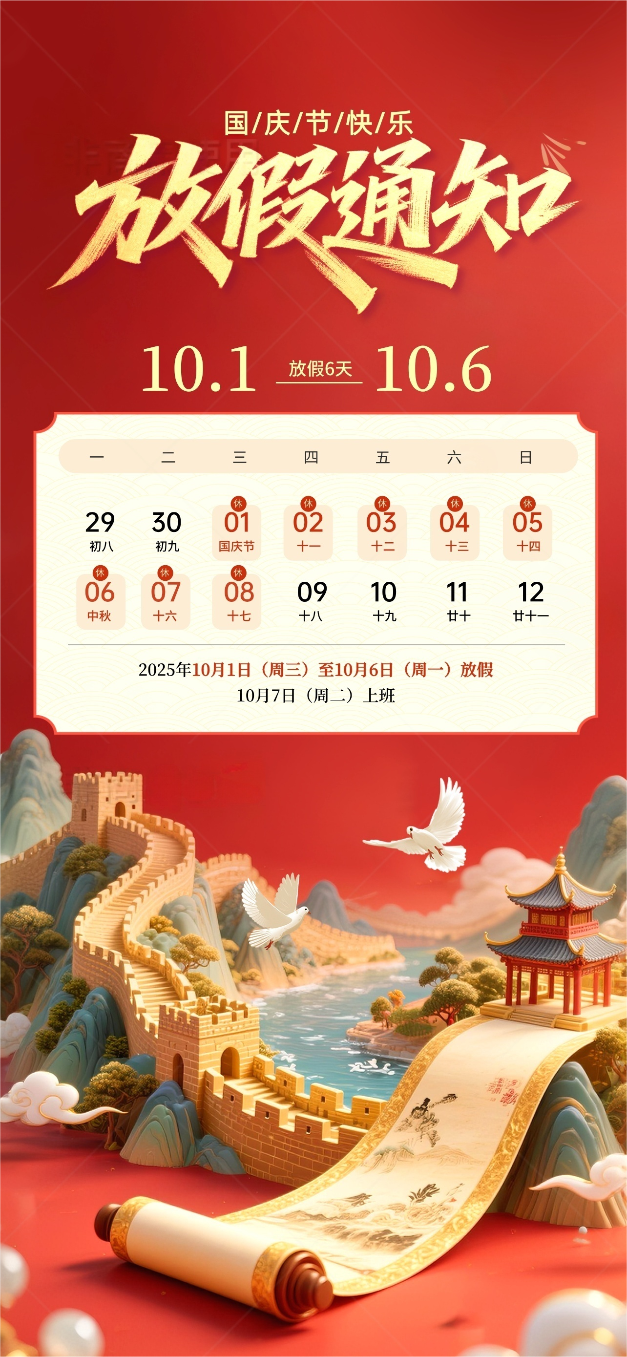 一、10月1日(国庆节)至10月6日(中秋节)共放假6天,节日期间大家外出游玩、走亲访友请一定注意出行安全,10月7日正常上班。